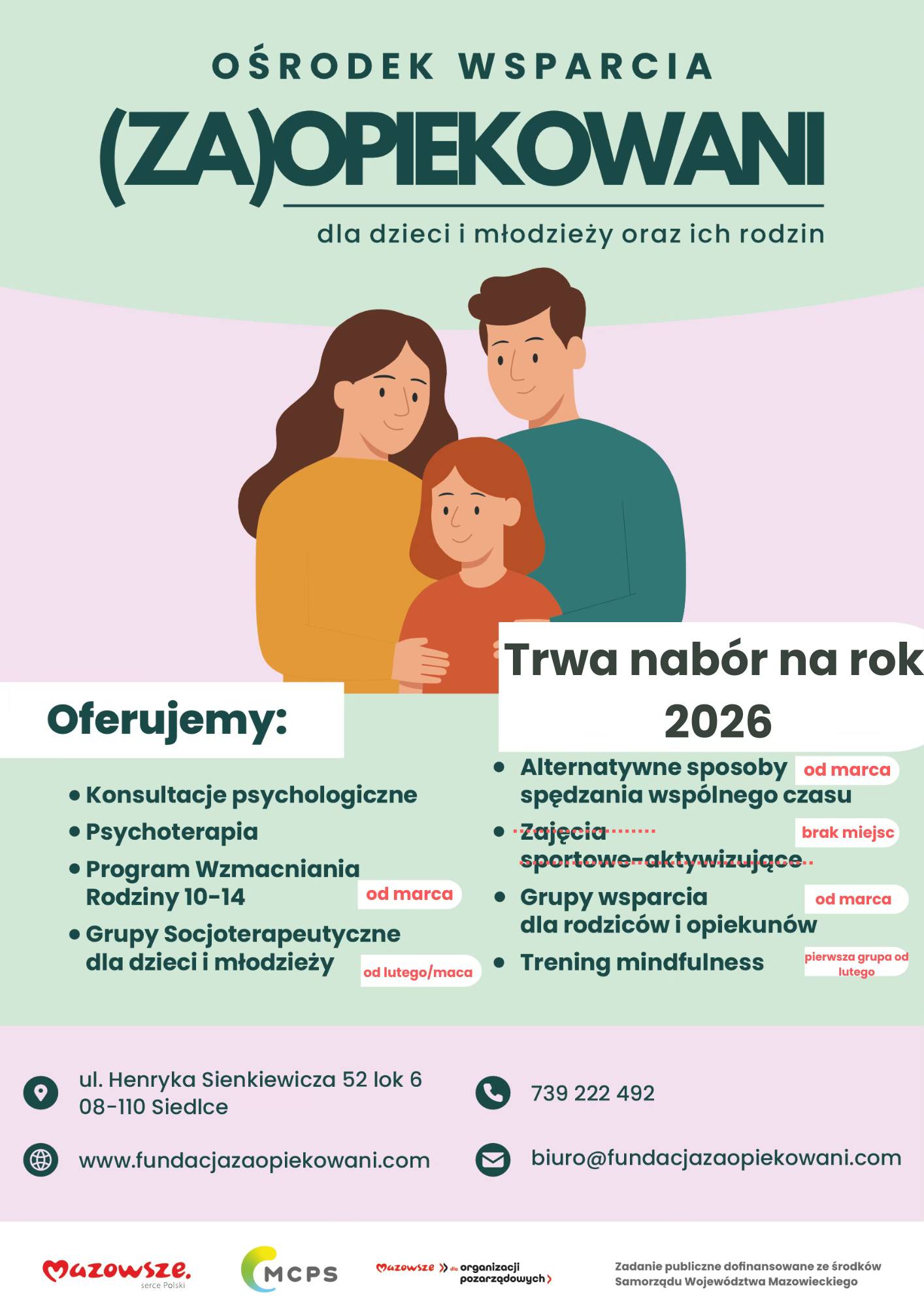 W minionym roku objęliśmy wsparciem ponad 800 osób – dzieci, młodzież, rodziców, opiekunów zastępczych, nauczycieli i specjalistów. Realizowaliśmy aż 5 projektów ze środków publicznych; dwa z nich realizowane były z funduszy miasta Siedlce w ramach działania „Przeciwdziałanie uzależnieniom i patologiom społecznym”, a 3 pozostałe to Ośrodek Wsparcia – (ZA)OPIEKOWANI 3letnie Zadanie publiczne dofinansowane ze środków Samorządu Województwa Mazowieckiego, oraz „Wrażliwi na emocje, otwarci na dialog – wsparcie opiekunów z pieczy zastępczej.” oraz „Wsparcie dzieci z rodzin zastępczych.” to Zadanie publiczne sfinansowane ze środków Samorządu Województwa Mazowieckiego.